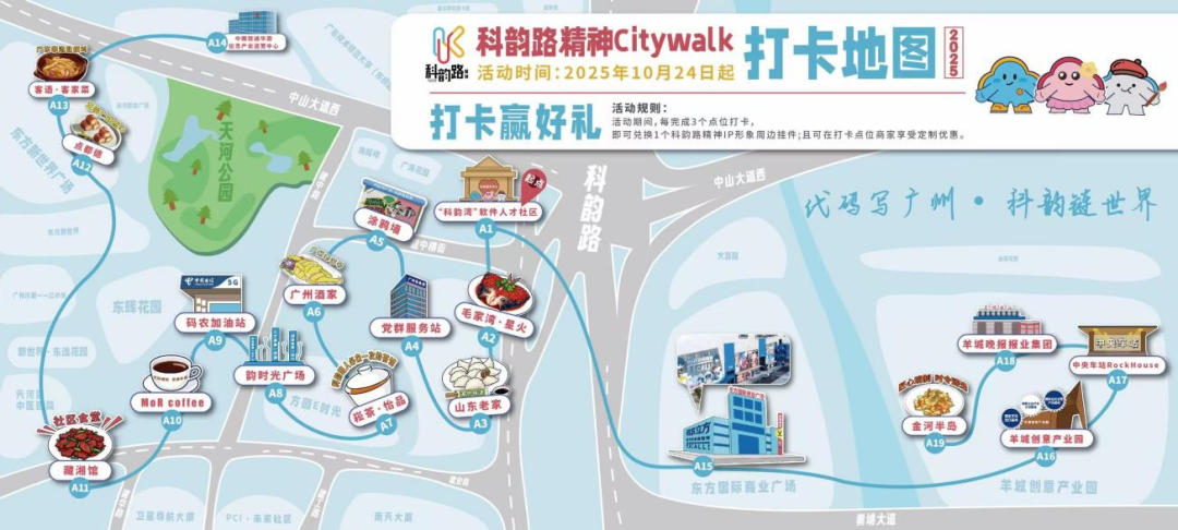 线路从科韵湾软件人才社区出发,贯穿东方新世界广场、中国联通华南信息产业运营中心、羊城创意产业园、东方国际商业广场,全程约4公里,共设置19个特色打卡点位。